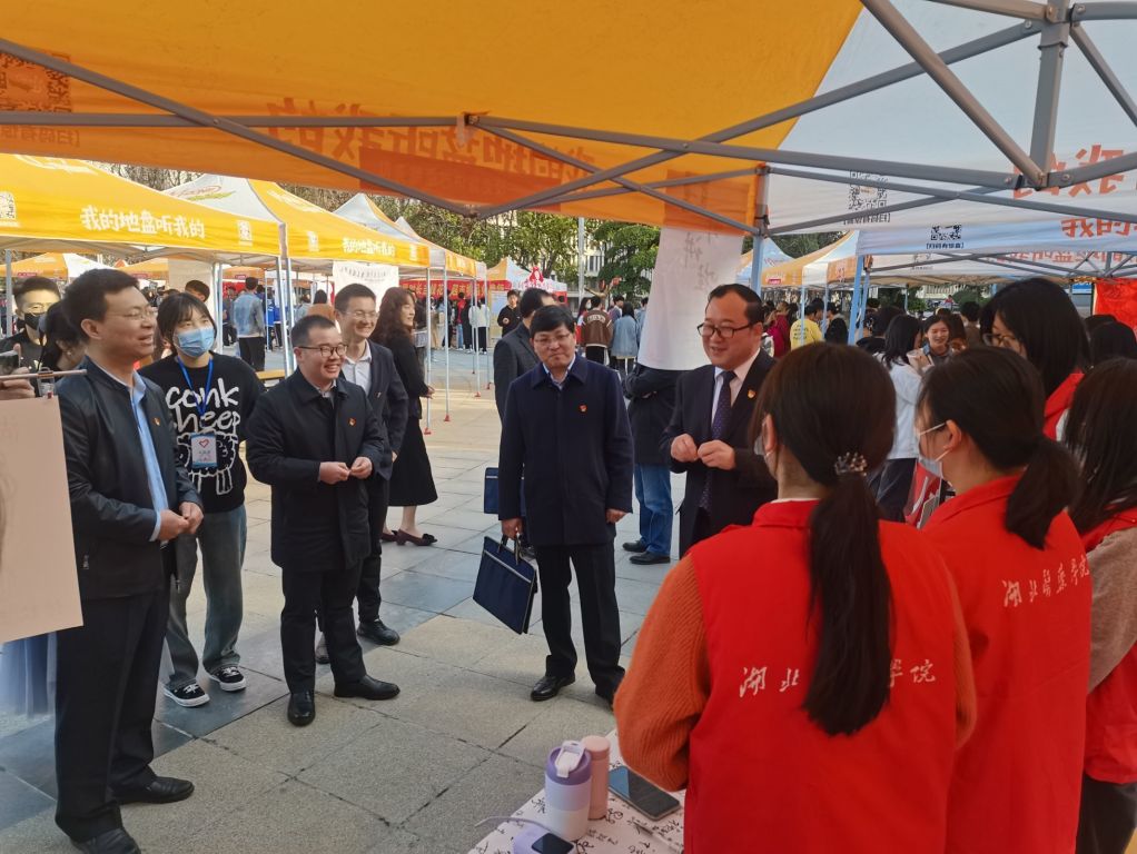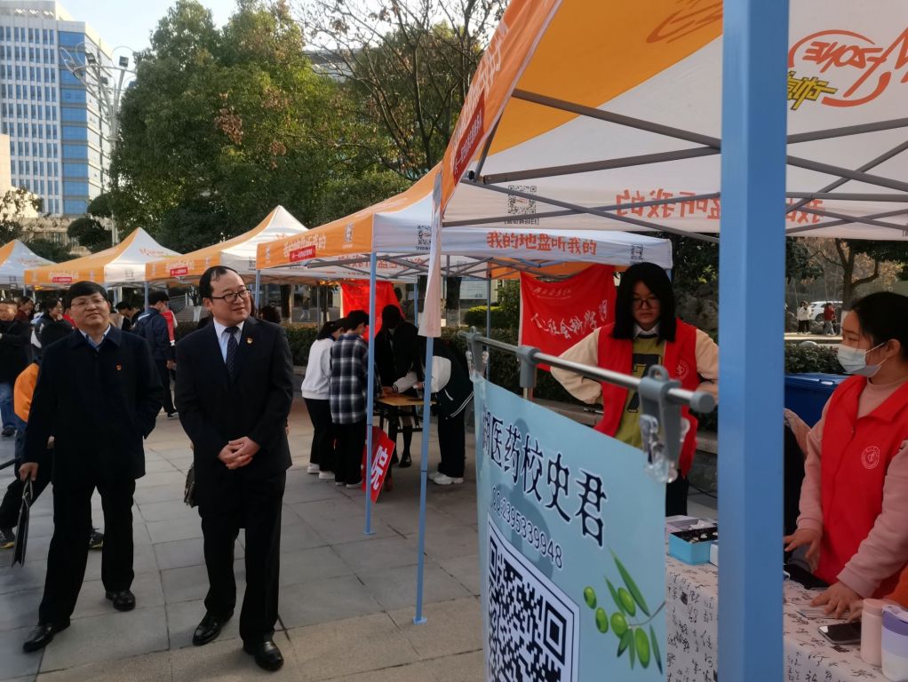 启动仪式后,校党委书记涂汉军教授、校党委常委、组织部长张海蛟等领导老师来到校史宣讲志愿服务队的摊位,与同学们亲切交流,涂汉军书记表示,以后有机会将为同学们分享更多的校史故事,为同学们传授讲解经验及技巧。同学们也热情地邀请各位领导老师品尝为活动准备的小糖果,气氛十分热烈。